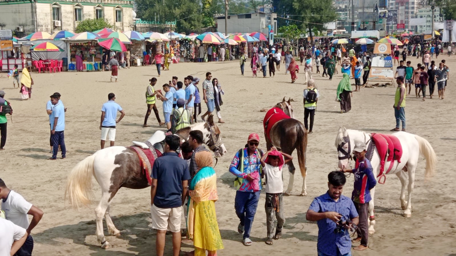 সৈকতের বিভিন্ন পয়েন্টে গিয়ে দেখা যায়, সাগর তুলনামূলক শান্ত থাকায় পর্যটকদের বাড়তি উৎসাহ রয়েছে সমুদ্রস্নানে। বালুচরে বিচ বাইক, ঘোড়ায় চড়া, জেড স্কীতে সমুদ্র ভ্রমণ, সব মিলিয়ে জমজমাট দৃশ্য। শিশুরা ভেজা মাটি দিয়ে তৈরি করছেন খেলনার প্রাসাদ। বড়রা খুঁজে নিচ্ছেন ক্লান্তি দূর করার প্রশান্তি।